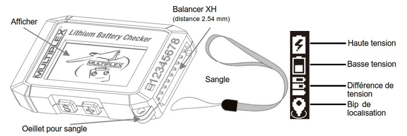 - Buzzer de localisation intégré (Model Finder) : le vérificateur de batterie au lithium utilise un capteur de position intégré pour détecter si le modèle est en mouvement ou pas. Au moyen du seuil réglable, un signal acoustique peut être émis après une minute d’immobilisation, de sorte que l’on retrouve son modèle égaré dans de hautes herbes, hors du terrain de vol... Toujours « où cela n'arrive qu'aux autres »...