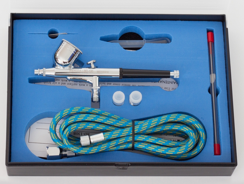 Le kit pistolet à peinture Fengda BD-130 propose un aérographe professionnel « double action » entièrement accessible au grand public. Le modèle est livré avec trois buses d'un diamètre de 0.2, 0.3 et 0.5 mm, et convient donc également à la pulvérisation de peintures ou laques aux pigments grossiers.