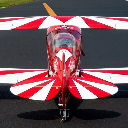 Agile et précis, grâce aux quatre servos d’ailerons, cette version du biplan de voltige Pitts S-2B présente le décor emblématique du pilote de salons aériens Rich Goodwin.