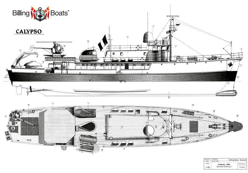 La reproduction Billing Boats à l’échelle 1/45ième de la célèbre Calypso a été réalisée d’après les plans originaux et avec l’aimable coopération de la Fondation Cousteau.