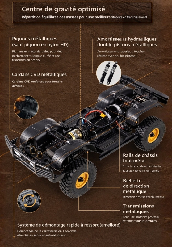 Pensé pour les amateurs de modèles réduits réalistes, ce crawler combine une mécanique performante avec une finition haut de gamme orientée scale.