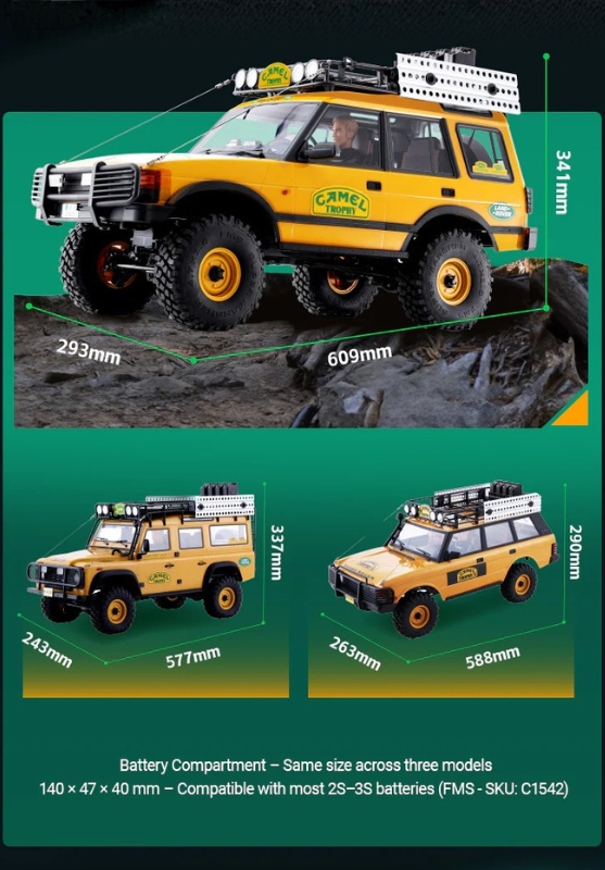 Le Land Rover Discovery Series FCX10 FMS est un crawler RC 1/10 conçu pour le franchissement réaliste et le pilotage tout-terrain technique. Sa carrosserie rigide ultra détaillée s’inspire du mythique Discovery de première génération, tandis que le châssis FCX10 offre une transmission moderne, robuste et efficace.
