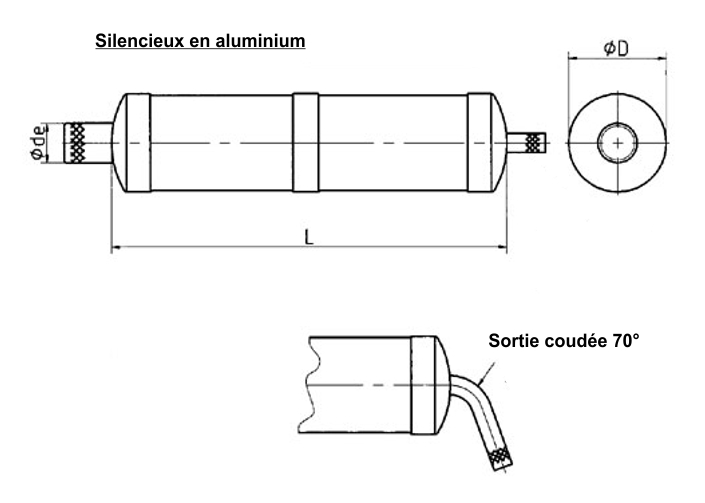Echappement avec l'entrée des gaz à l'avant et sortie à l'arrière du pot. La sortie est coudée à 70° pour permettre l'éjection des gaz vers le bas de l'avion. Ce pot contient 4 chambres.
