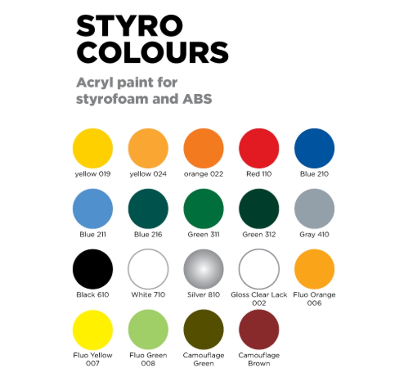 Les peintures en bombes RC Styro Colours de GHIANT sont spécialement conçues pour la mise en peinture du Polystyrène, du Depron, du Styrofoam, de l'EPP/EPO ainsi que bien d'autres matériaux synthétiques et autres.