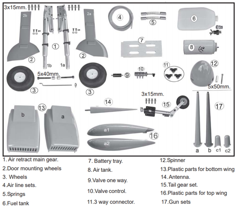 - Tous les accessoires nécessaires au montage du modèle : commandes, guignols, visserie, …,